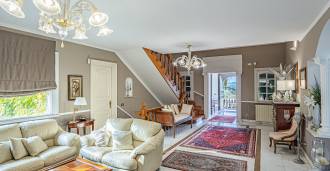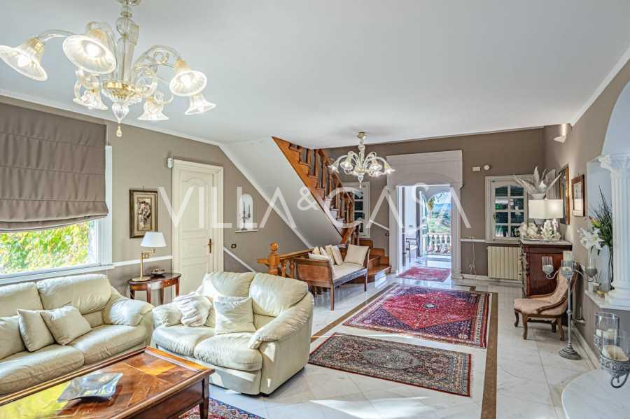 Vila išsiskiria keturiais aukštais, stebindama savo apgalvota architektūra ir elegantišku interjero dizainu. Didžiulis paradinis kiemas su simetriškais laiptais veda prie pagrindinio įėjimo, atverdamas erdvę, kur kiekvienas elementas sukurtas komfortui ir malonumui. Pirmame aukšte svečius pasitinka prabangi priėmimo zona su privataus rūmo atmosfera: erdvi svetainė su židiniu, išskirtinis kabinetas ir elegantiškas svečių miegamasis su vonios kambariu sukuria jaukumo ir kilnumo harmoniją.